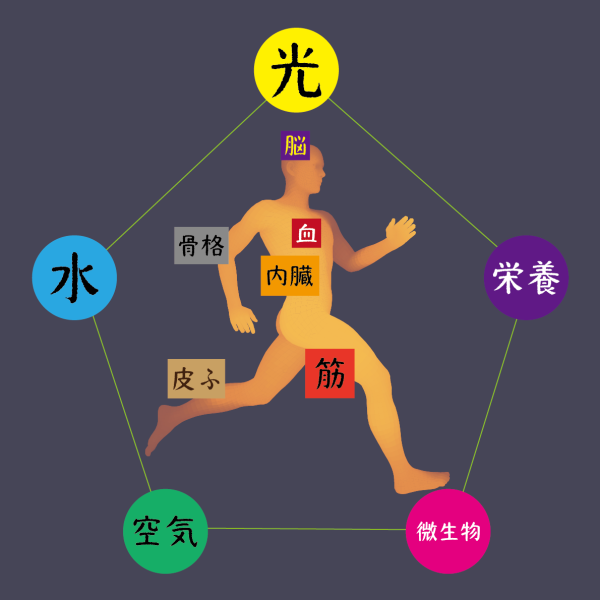 人間も上図のように、体外から「光」「栄養」「水」などを得ると、それが体内環境を整えて活動を行うことができます。