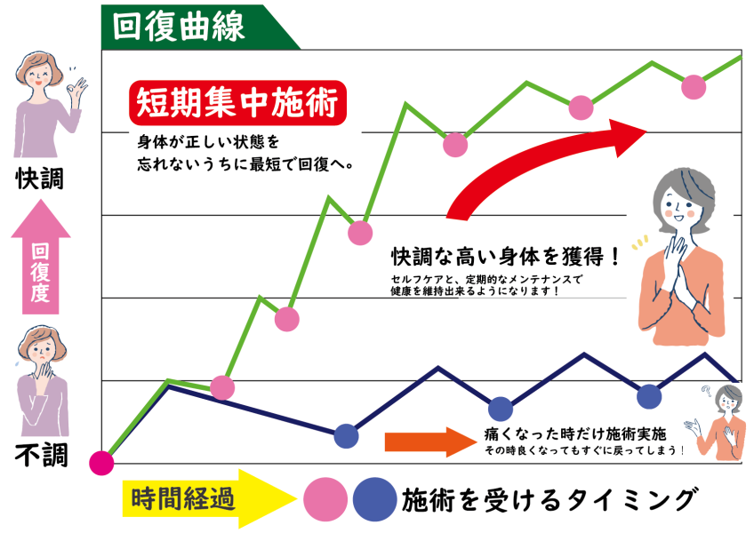 当院では、上図の緑・ピンクで構成された折れ線グラフのように、初回から数回は施術を受ける頻度を比較的多くし、早く高い次元に移行できるよう「短期集中型」でサポートします。その後、容体が落ち着いてきたら1か月程度を目安に整体を受ける間隔をあけていき、再発の防止、また健康な毎日が続くようサポートします。